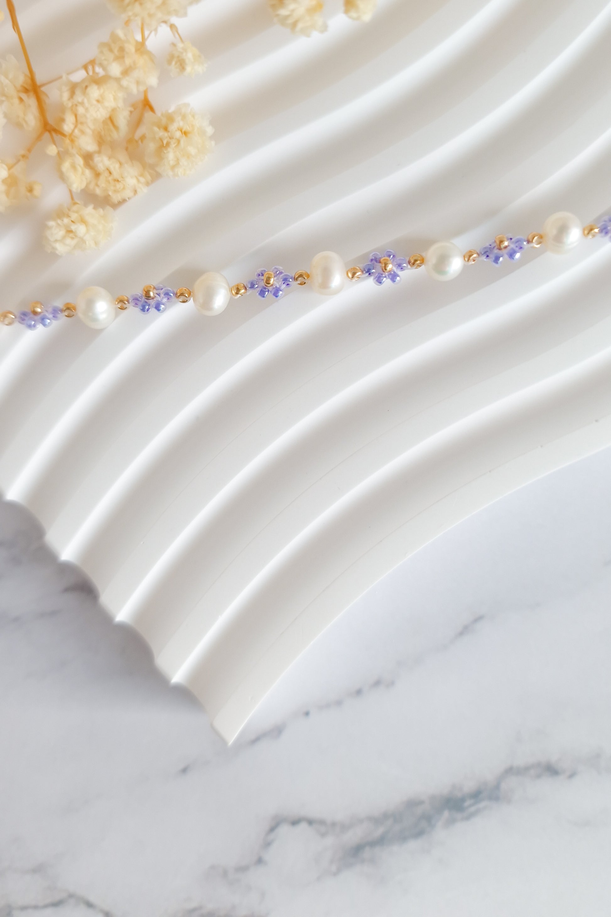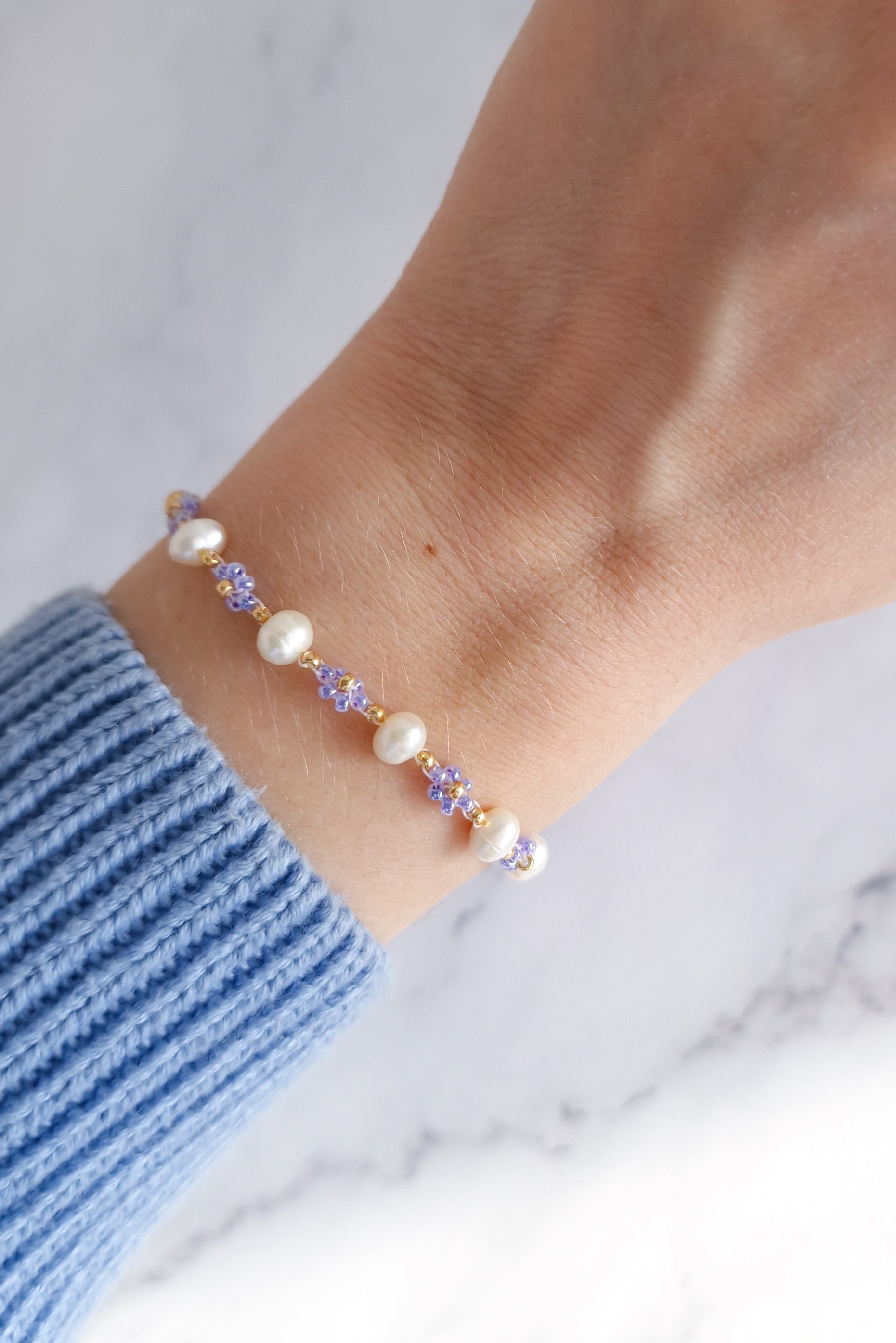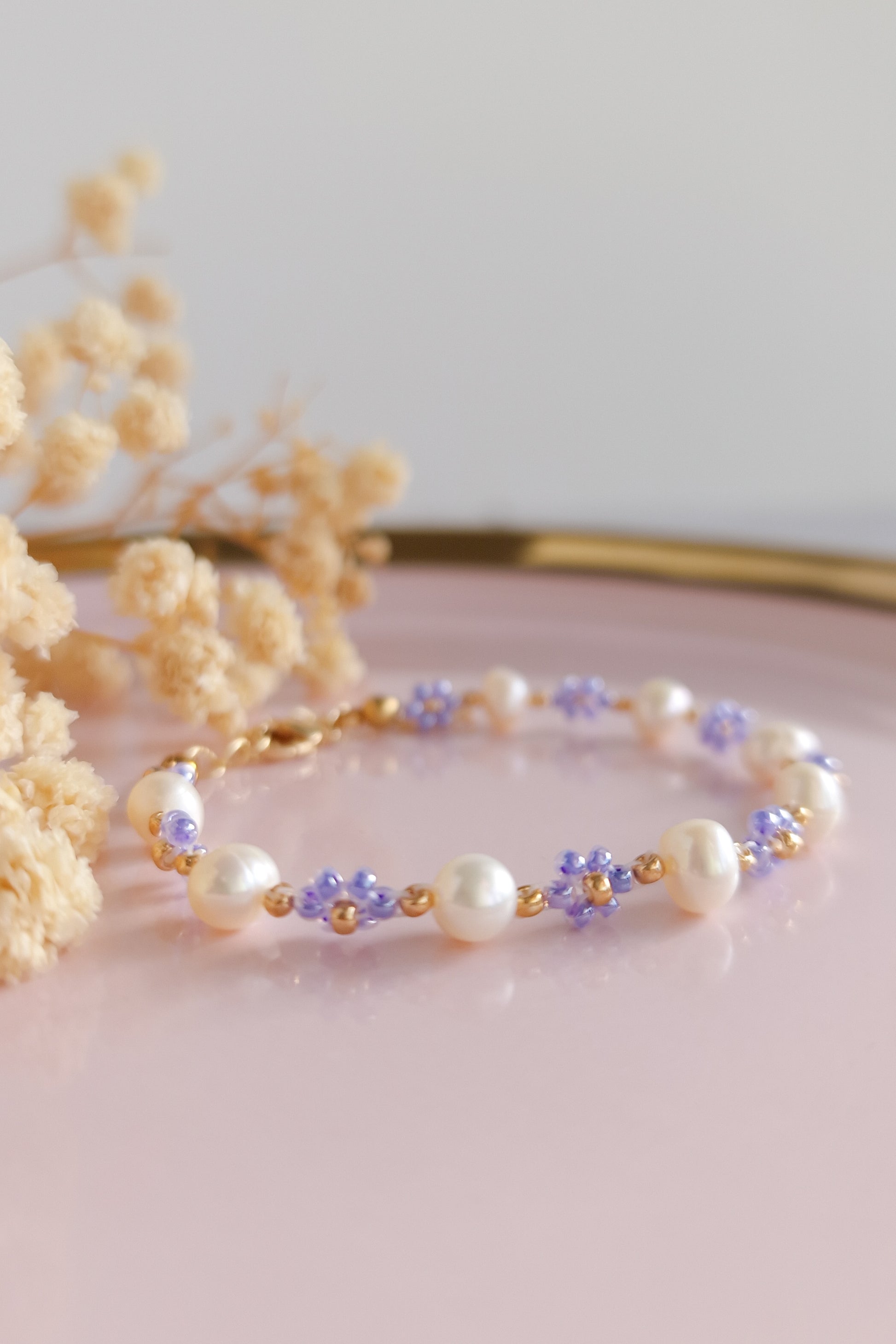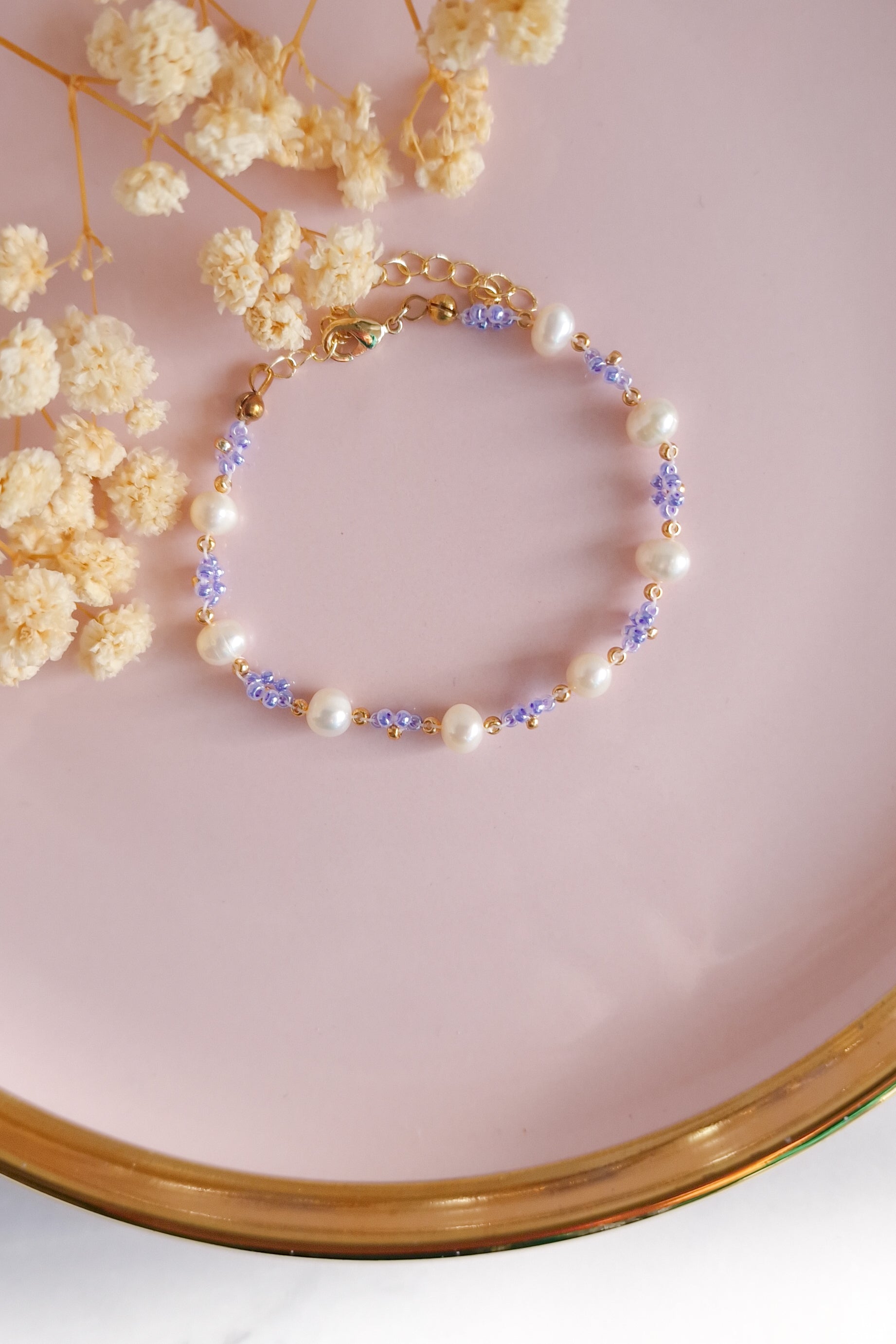 This dainty bracelet is made of Miyuki glass beads, freshwater pearls and gold plated jewellery findings.