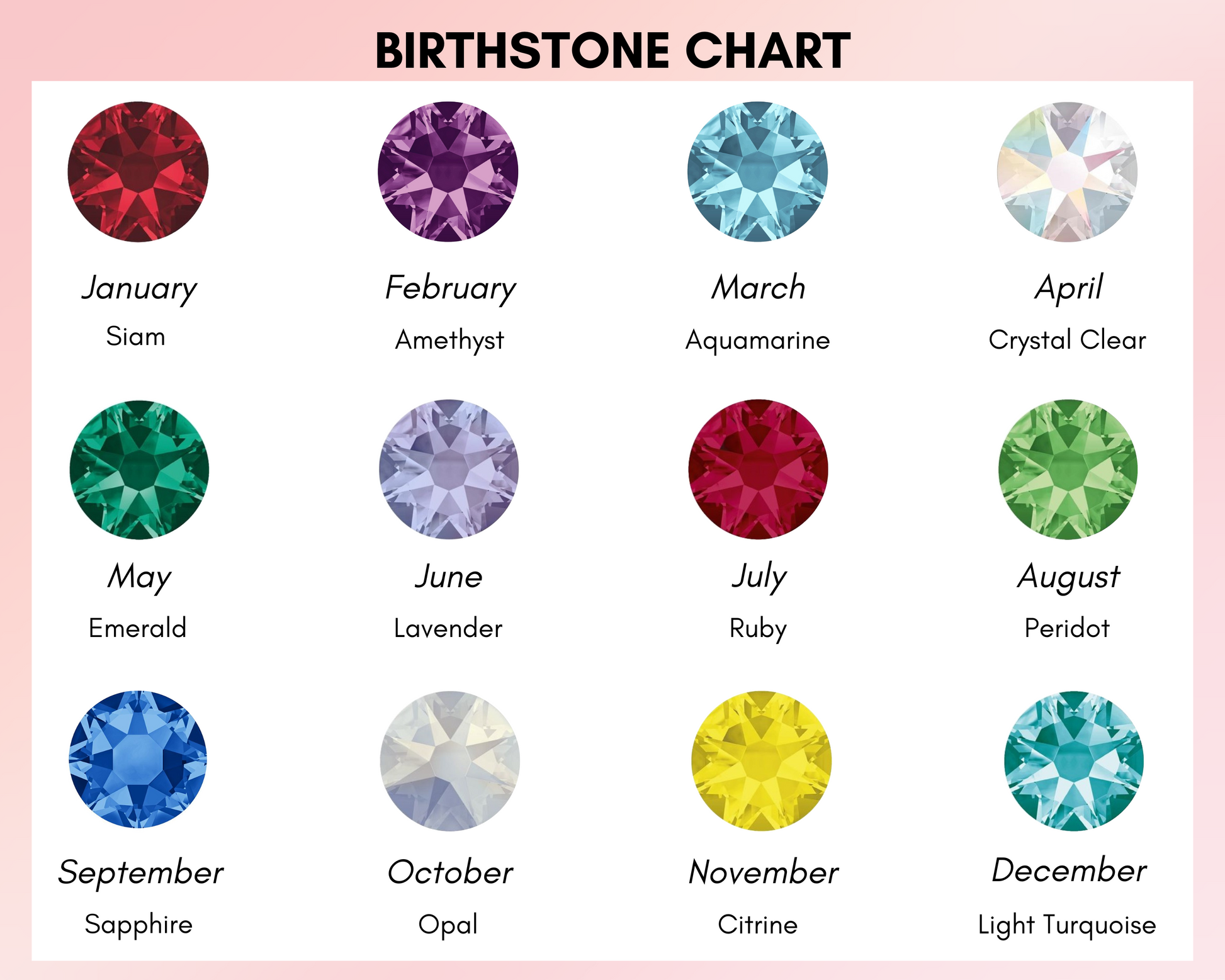 Choose crystal colour from the Birthstone Chart.
