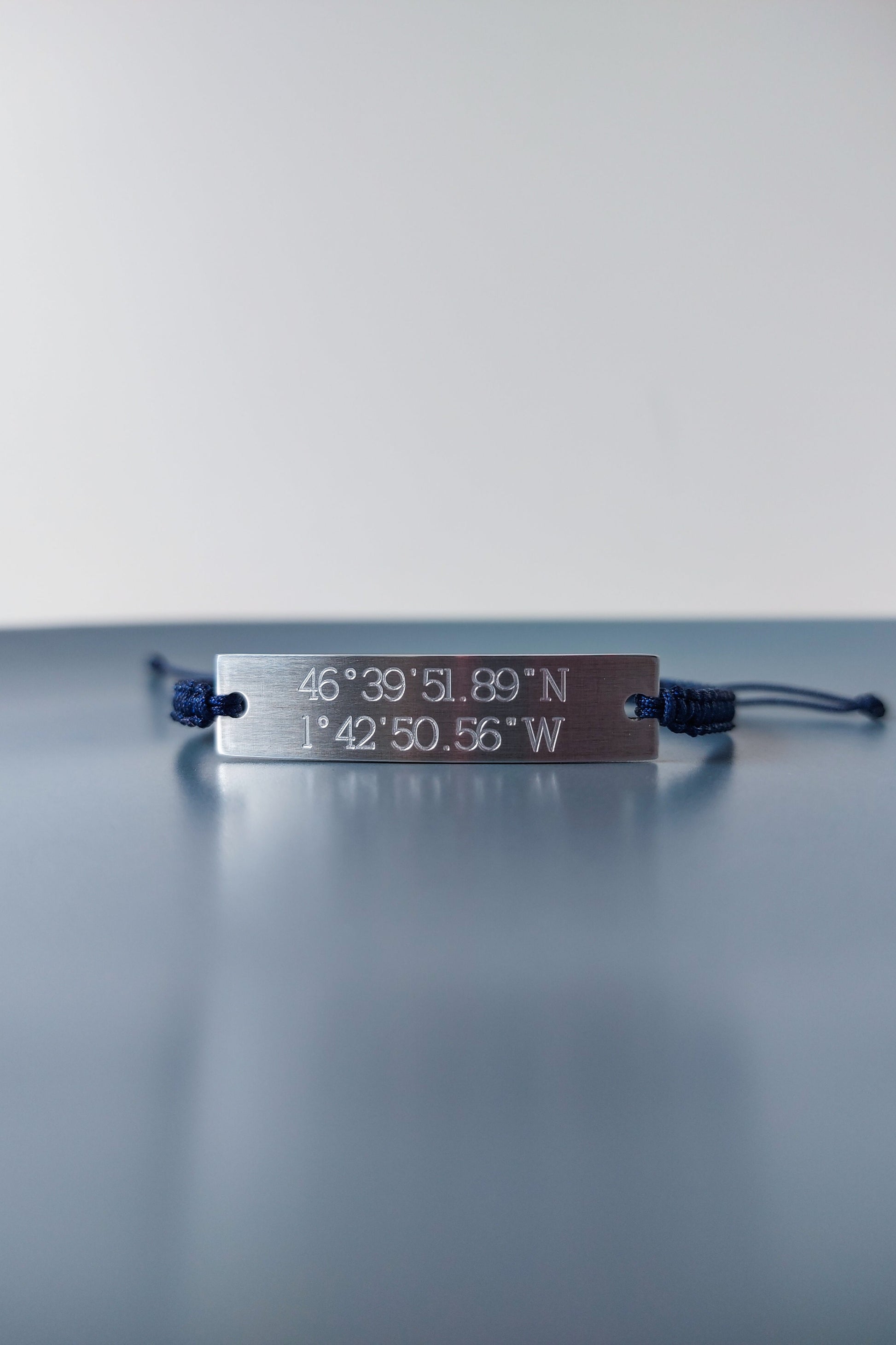 The engraved text bar is made of aluminium. The cord is made of nylon.