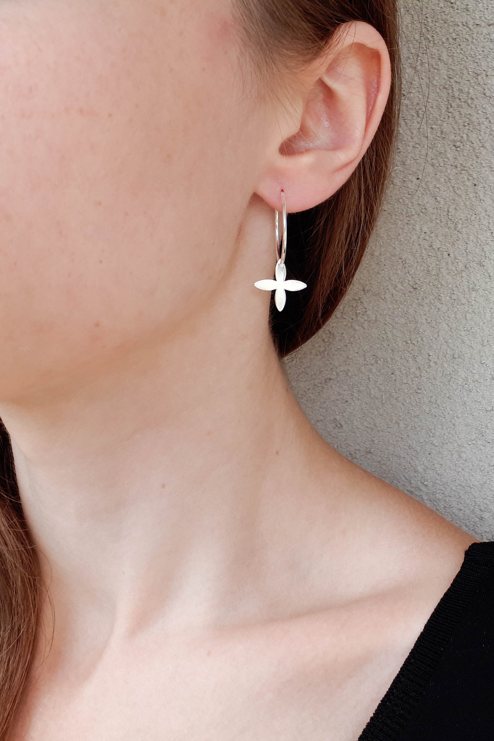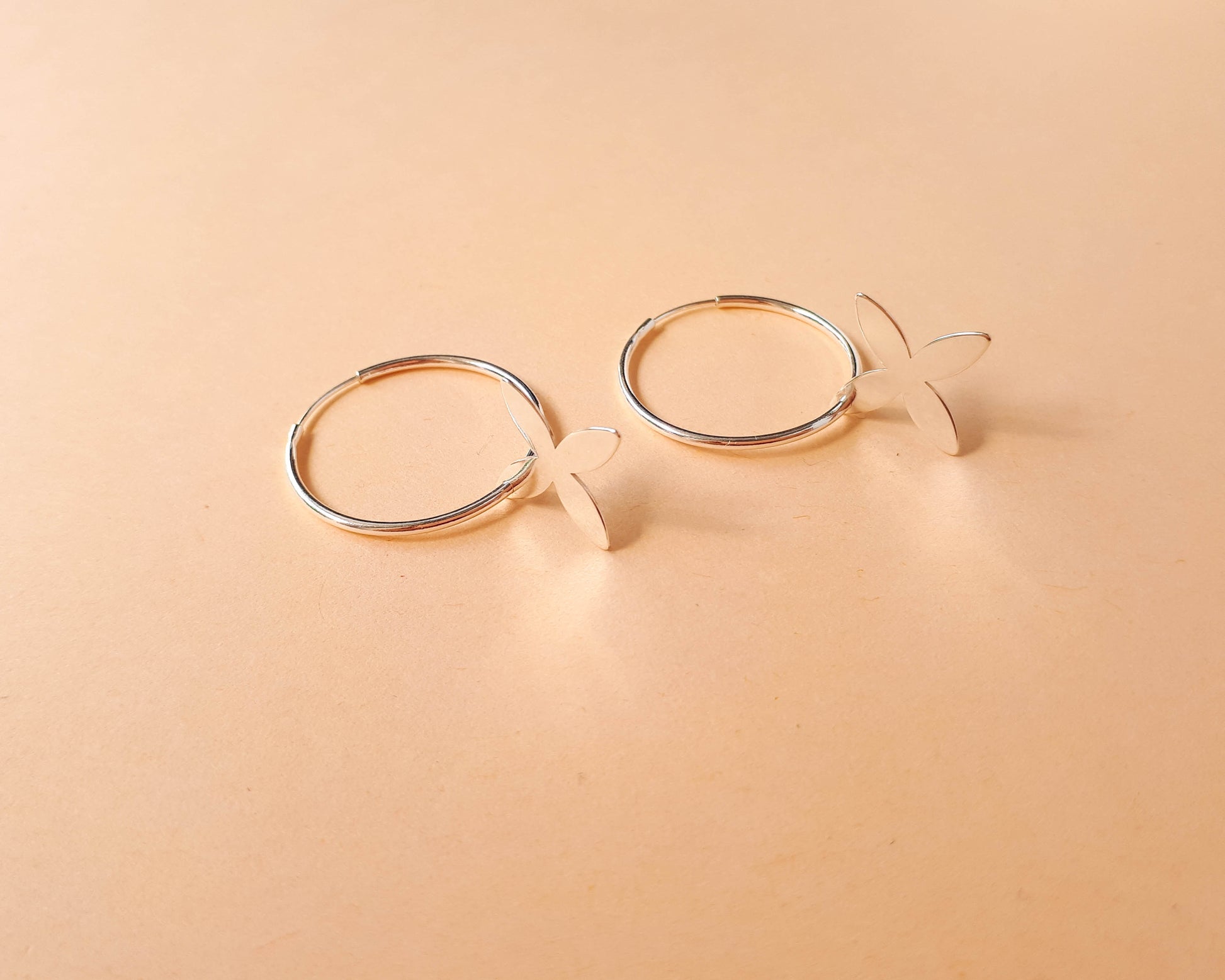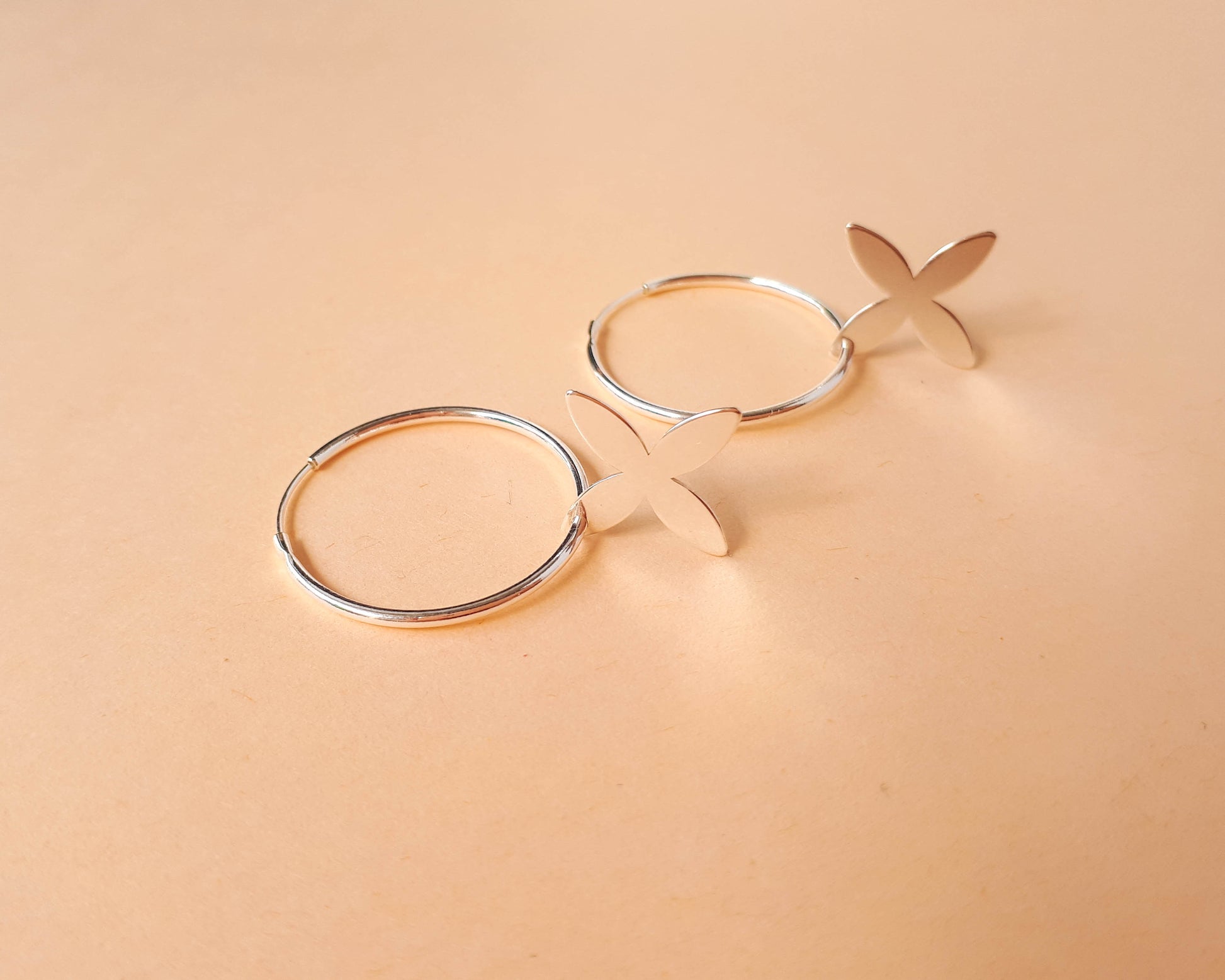 These sterling silver hoops with flower charms are minimalist in style. They are easy to combine with other jewellery pieces and comfortable to wear because they don't weigh much. These earrings will make a great gift for someone special or yourself. Sterling silver jewellery is high quality and will last you for years if you take good care of it.